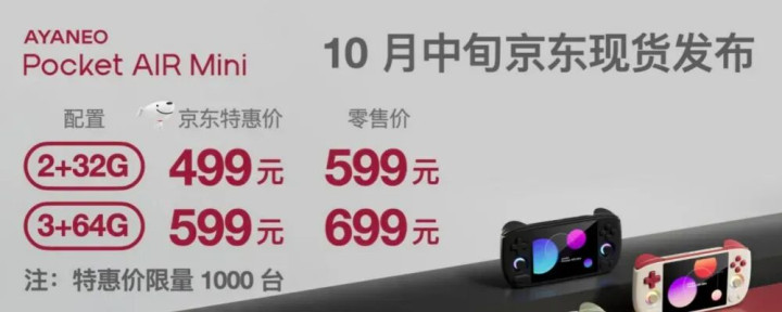 具体价格方面,AYANEO Pocket AIR Mini 2GB + 32GB 版本京东特惠价为 499元,3GB + 64G 版京东特惠价为 599元